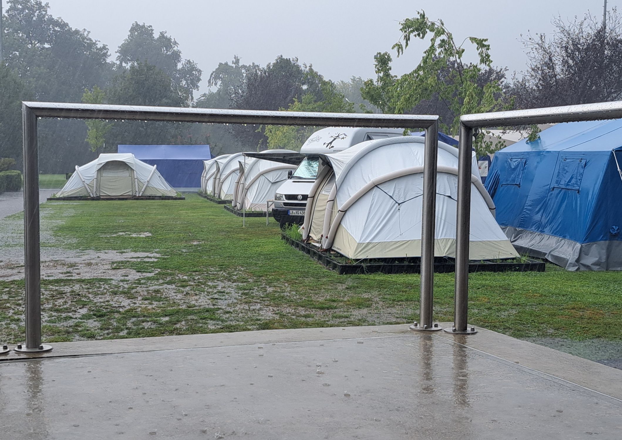 Innerhalb von 48 Stunden gingen über dem Tessin Unmengen an Regen nieder, so dass nicht nur der Rhein auf dem Weg zum Bernardino unheimlich anschwoll, sondern auch der Camping-Platz des Centro Sportivo bis zum Montagabend unter Wasser stand. Ein großes Lob an die Jungs, die ihren Vierfach-Umzug, um die mitgebrachten Zelte trocken auf- und dann wieder abzubauen, einigermaßen gelassen hinnahmen.