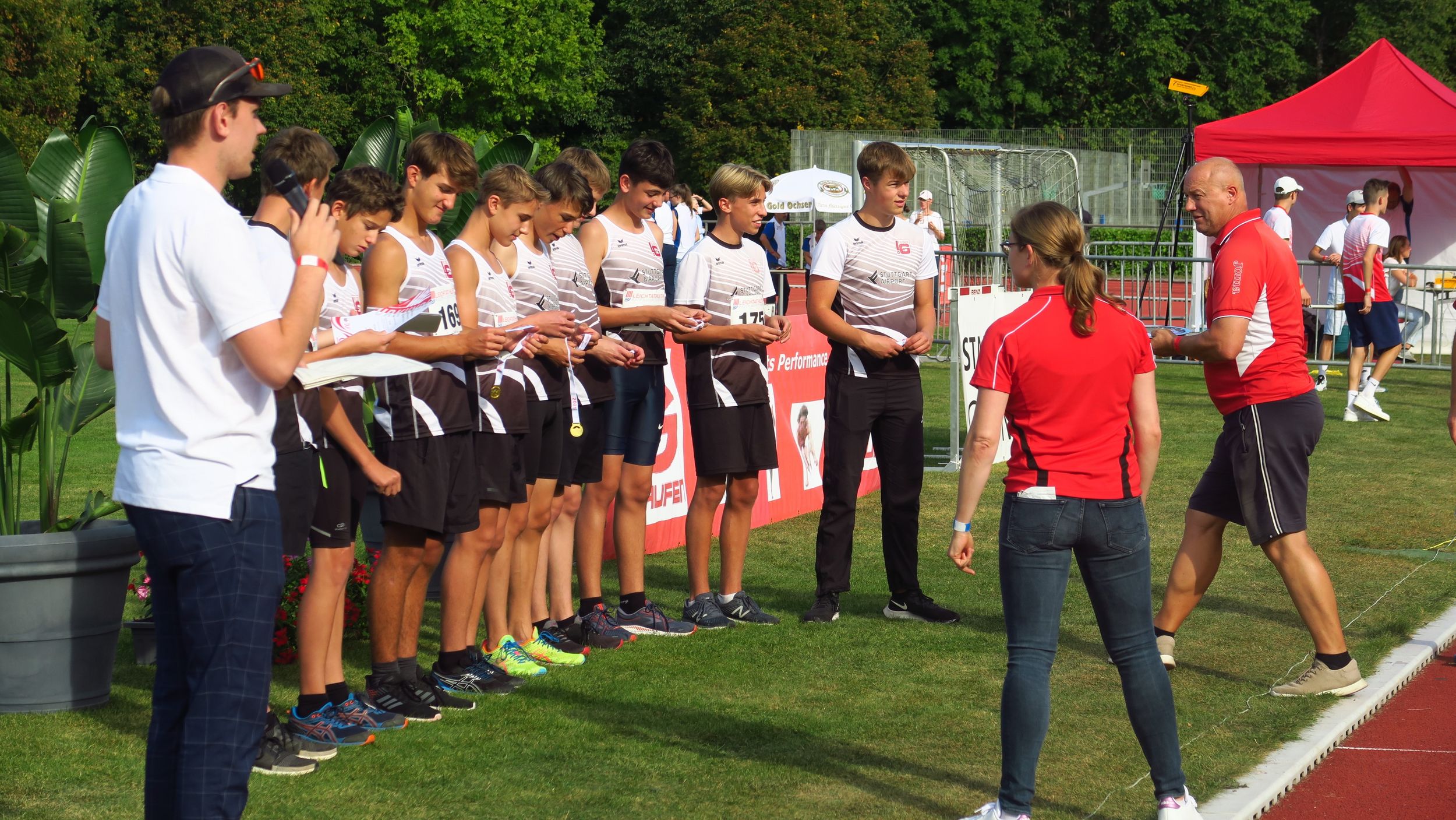 Härter umkämpft war der Sieg der Ulmer U16-Mädchen, die erst am Ende 120 Punkte zwischen sich und die LG Filstal legen konnten. Vor allem der Hochsprung mit Landeskadernorm von 1,68 Meter für Franziska Wloka und das Speerwerfen mit 37,13 Meter für die deutsche Vizemeisterin Leni Schmid und 35,50 für Wloka drehten den Wettkampf zugunsten der Ulmerinnen. Für die LG Filstal sammelte Lara Jurcic mit 12,38 Sekunden über 100 Meter und 12,00 Sekunden über 80 Meter Hürden die meisten Punkte. Dritte wurde hier die LG Filder, bei der Marleen Ditze sich über starke 5,27 Meter im Weitsprung freuen durfte. Lediglich ein Duell zwischen der LG Filder und dem SSV Ulm 1846 gab es bei der männlichen U16. Hier setzten sich die breiter besetzen LG-Jungs, die in Jakob Eppinger mit 12,22 Sekunden über 100 Meter und 5,52 Meter im Weitsprung den besten Punktesammler hatten, letztlich deutlich durch und durften aus den Händen von LG Staufen-Trainer Lutz Dombrowski, Weitsprung-Olympiasieger von 1980, ihre Siegermedaillen in Empfang nehmen. Bei den Ulmern ragte der vielseitige Sören Ulshöfer heraus, der dieses Mal 13,04 Meter mit der Kugel noch 2:15,97 Minuten über 800 Meter folgen ließ.