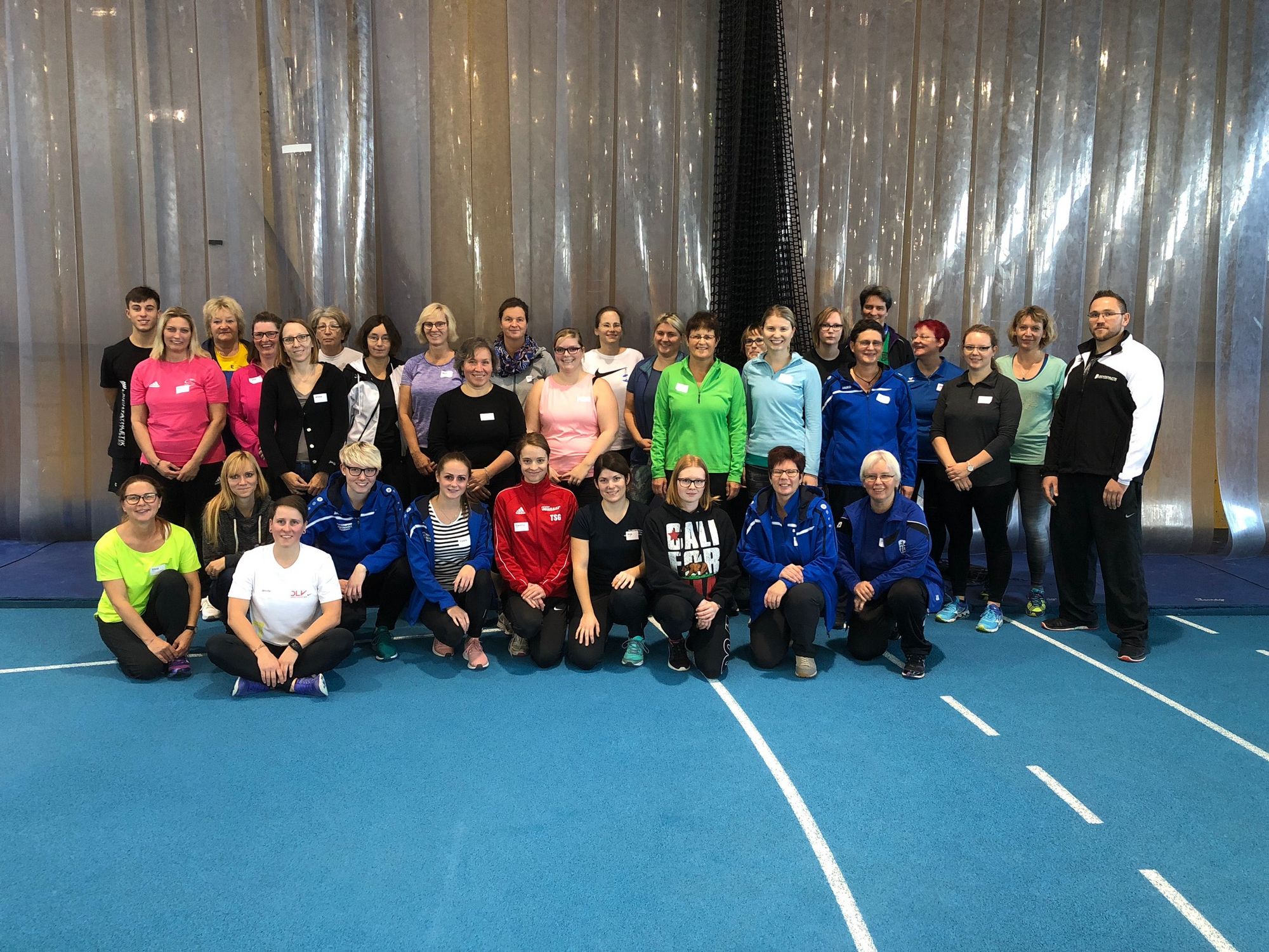 Nach einem ausgiebigen Mittagessen im Sportrestaurant Neckarpark mit einer Vielzahl an interessanten Gesprächen und mit regem Austausch zwischen den Teilnehmerinnen ging es im Seminarraum weiter. Florian Bauder als Landestrainer Mehrkampf stellte zunächst in einer kurzweiligen Präsentation die Möglichkeiten und Varianten im Training mit größeren Gruppen vor,bevor es dann in der Halle an das praktische Üben und Ausprobieren ging.